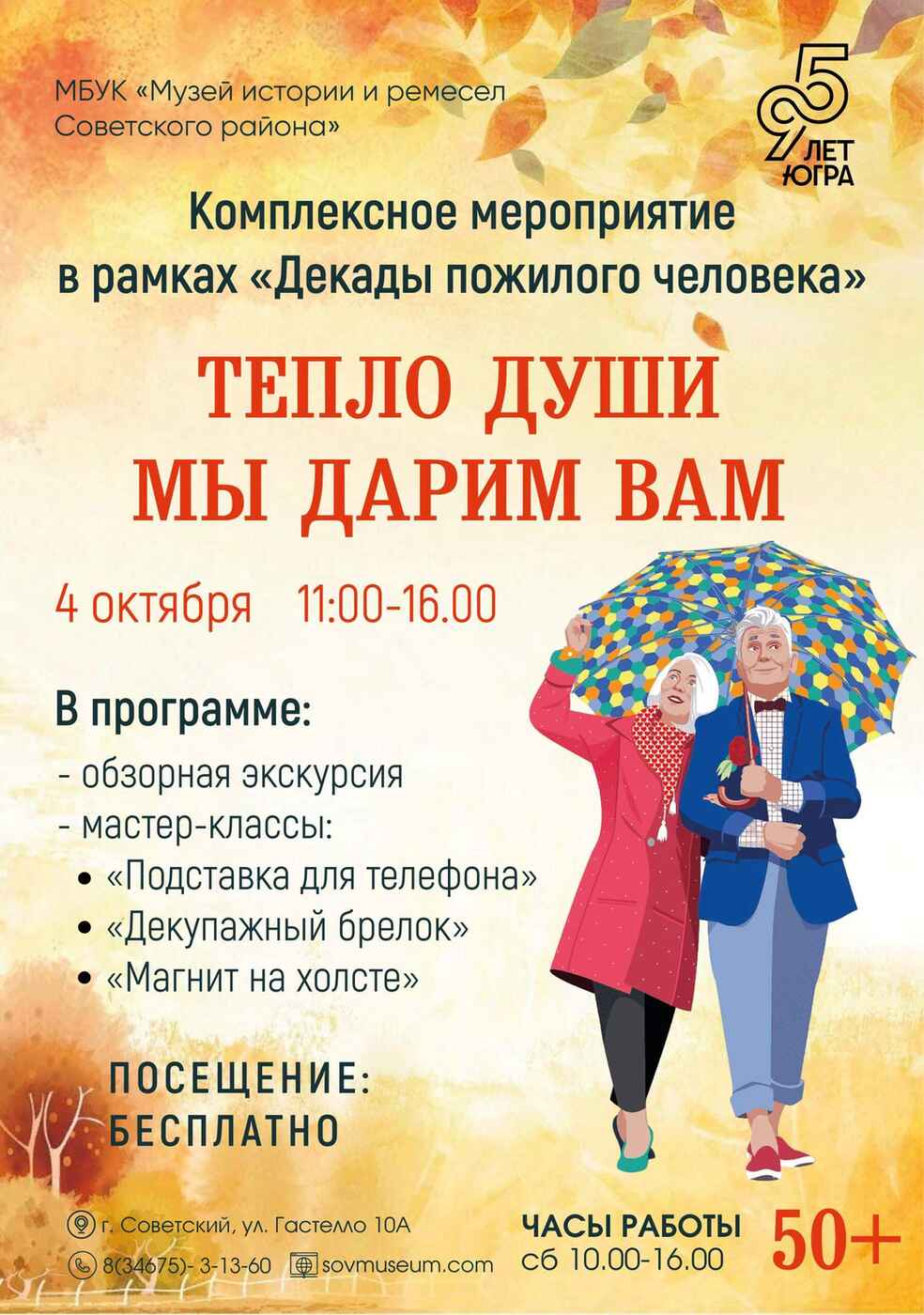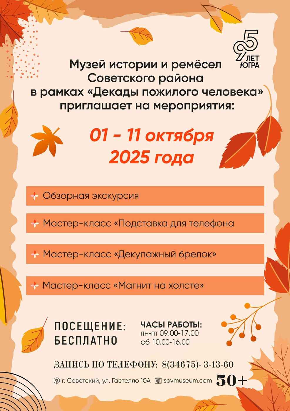 Вот и наступил октябрь. Это не только золотая осенняя пора, но и время, когда мы с особым вниманием и заботой относимся к старшему поколению. В рамках «Декады пожилого человека» с 1 по 11 октября Музей истории и ремесел Советского района приглашает представителей элегантного возраста на особую программу. Проведите эти осенние дни в теплой компании, наполняя их новыми знаниями, творчеством и общением! Зовите друзей и приходите вместе - будет душевно и интересно!