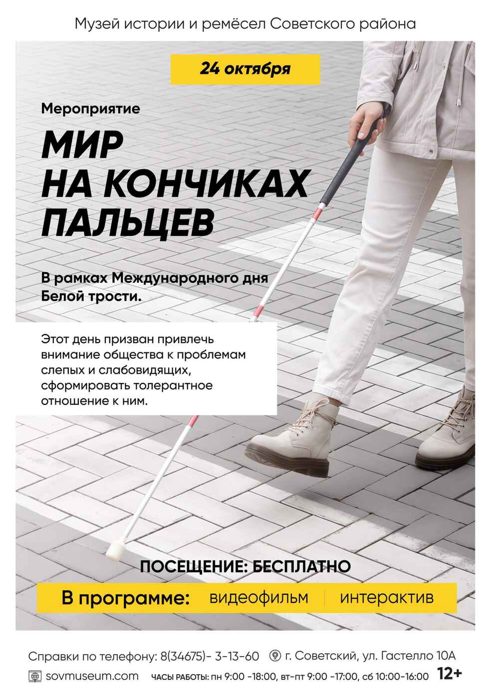 Как часто мы задумываемся о том, как воспринимают мир люди, лишенные зрения? Международный день белой трости - это возможность понять и почувствовать это. 24 октября приглашаем всех желающих в Музей истории и ремесел Советского района на мероприятие «Мир на кончиках пальцев». Участники мероприятия не просто поговорят о проблемах незрячих и слабовидящих, а попробуют прикоснуться к их миру посредством просмотра специального видеофильма и участия в интерактиве от представителей Всероссийского общества слепых.