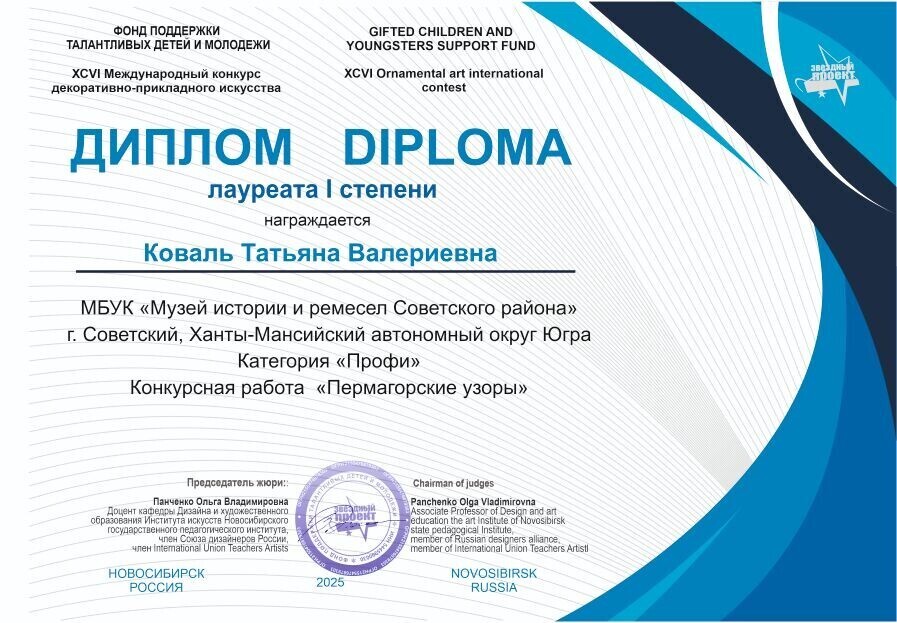 По итогам XCVI Международного конкурса декоративно-прикладного искусства Фонда поддержки талантливых детей и молодежи методист Музея истории и ремесел Советского района Коваль Татьяна Валериевна стала лауреатом I степени в категории «Профи».
