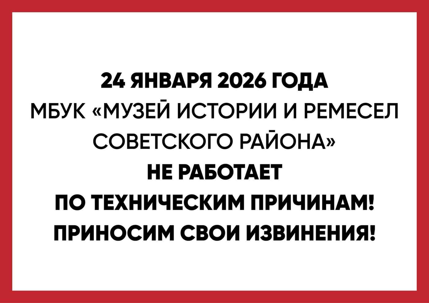 Уважаемые посетители! Обратите внимание, что 24 января 2026 года МБУК «Музей истории и ремёсел Советского района» не работает по техническим причинам.