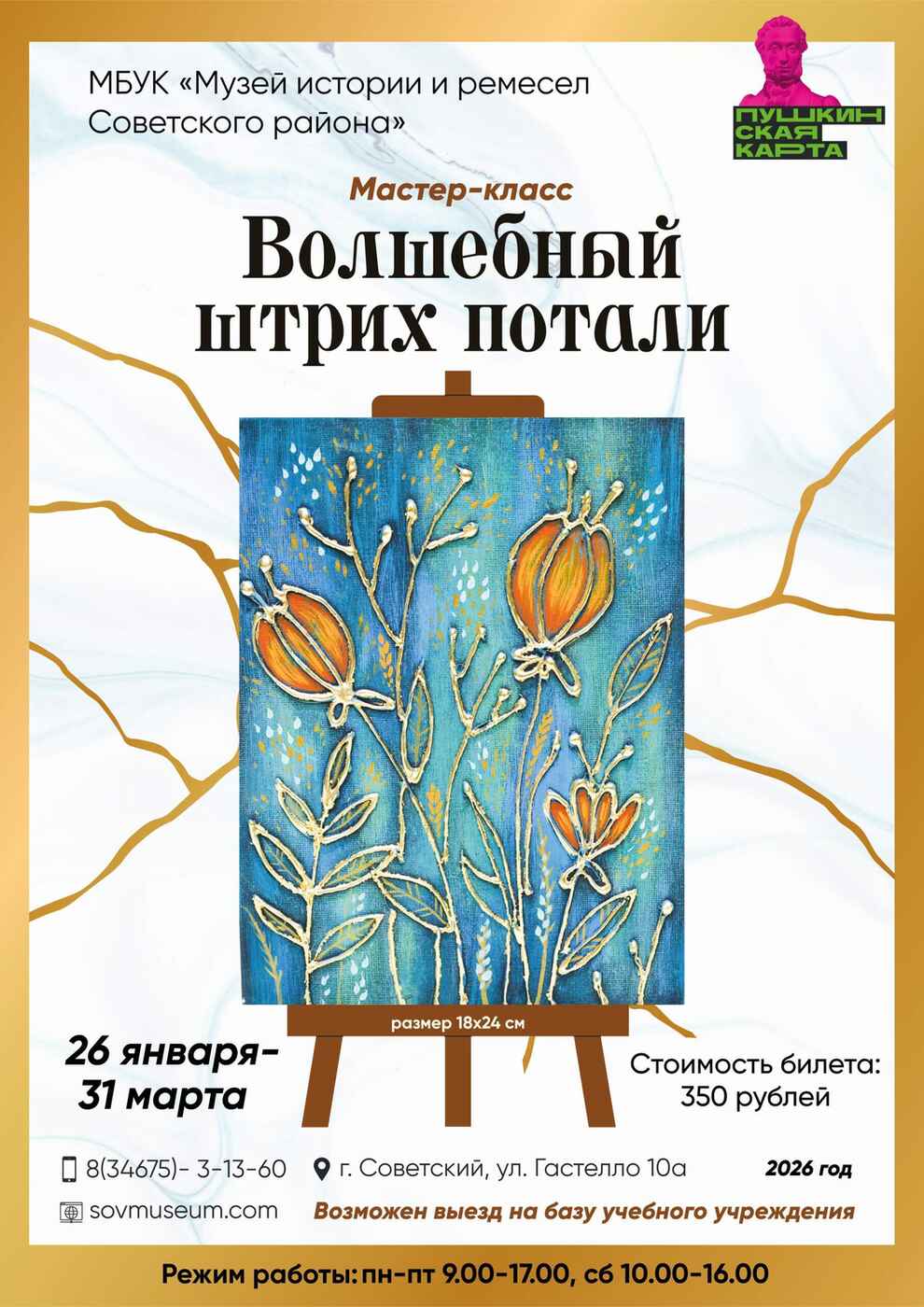 Вы освоите создание объемных 3D-картин и научитесь уникальной технике декора тончайшими листами потали - сусальным золотом. Этот благородный материал придает работе эффект драгоценного сияния. Вы создадите собственную неповторимую работу, которая станет украшением интерьера или отличным подарком. А еще это прекрасная возможность познакомиться с новой техникой, снять стресс и раскрыть творческий потенциал в уютной атмосфере музея.