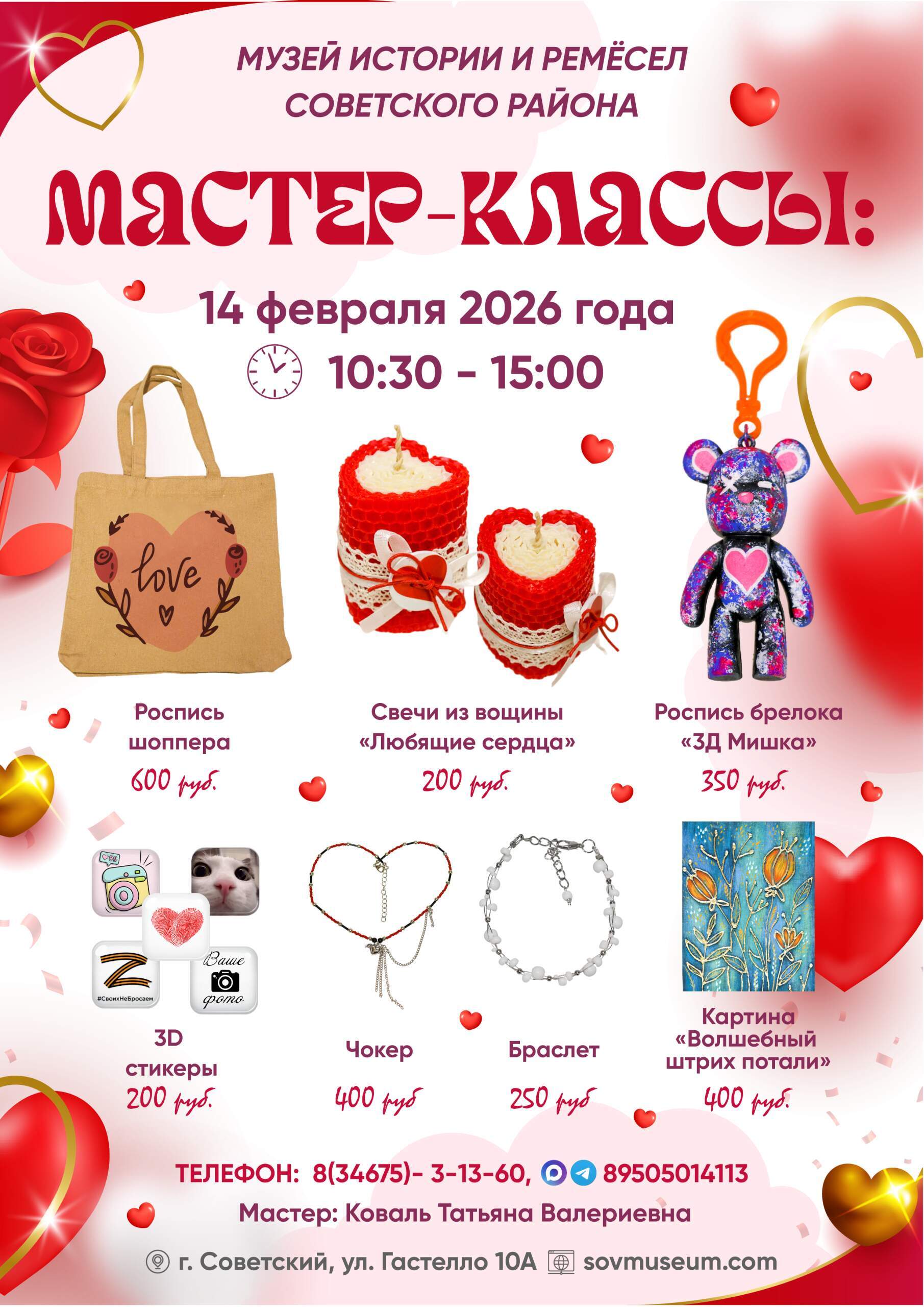 В воздухе витает романтическое настроение, навеянное ожиданием тепла и света, и в это время хочется дарить тепло и радовать себя и близких творческими подарками! Окунитесь в атмосферу творчества и романтики! Ждём всех желающих 14 февраля с 10:30 до 15:00 в Музее истории и ремесел Советского района.