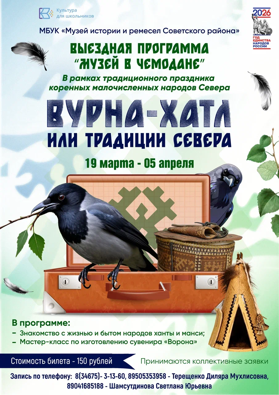 Традиционный праздник «Вурна-Хатл» (Вороний день) - это день встречи весны, тепла и новой жизни. И мы приглашаем вас разделить этот праздник с нами! С 19 марта по 5 апреля приглашаем организованные группы детей на выездную программа «Вурна-Хатл или традиции Севера» в рамках проекта «Музей в чемодане».