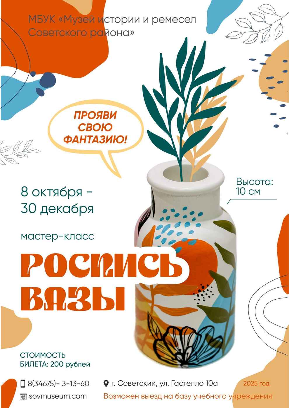 Поздней осенью не хватает цвета и уютных деталей. Согласны? Значит настало время это исправить! Приглашаем вас на творческий мастер-класс по росписи вазы. Вы создадите милый и яркий декор для своего дома самостоятельно. А может, это будет подарок для близкого человека? Включайте фантазию - мы предоставим всё остальное! Для участников мастер-класса уже подготовлены все необходимые материалы: гипсовые заготовки вазы высотой 10 см, кисти, краски, идеи для вдохновения, уютная атмосфера и море хорошего настроения! Стоимость участия: 200 рублей Запись и дополнительная информация по телефону: 3-13-60 Наш адрес: г. Советский, ул. Гастелло, 10А Количество мест ограничено, успевайте записаться до 30 декабря!