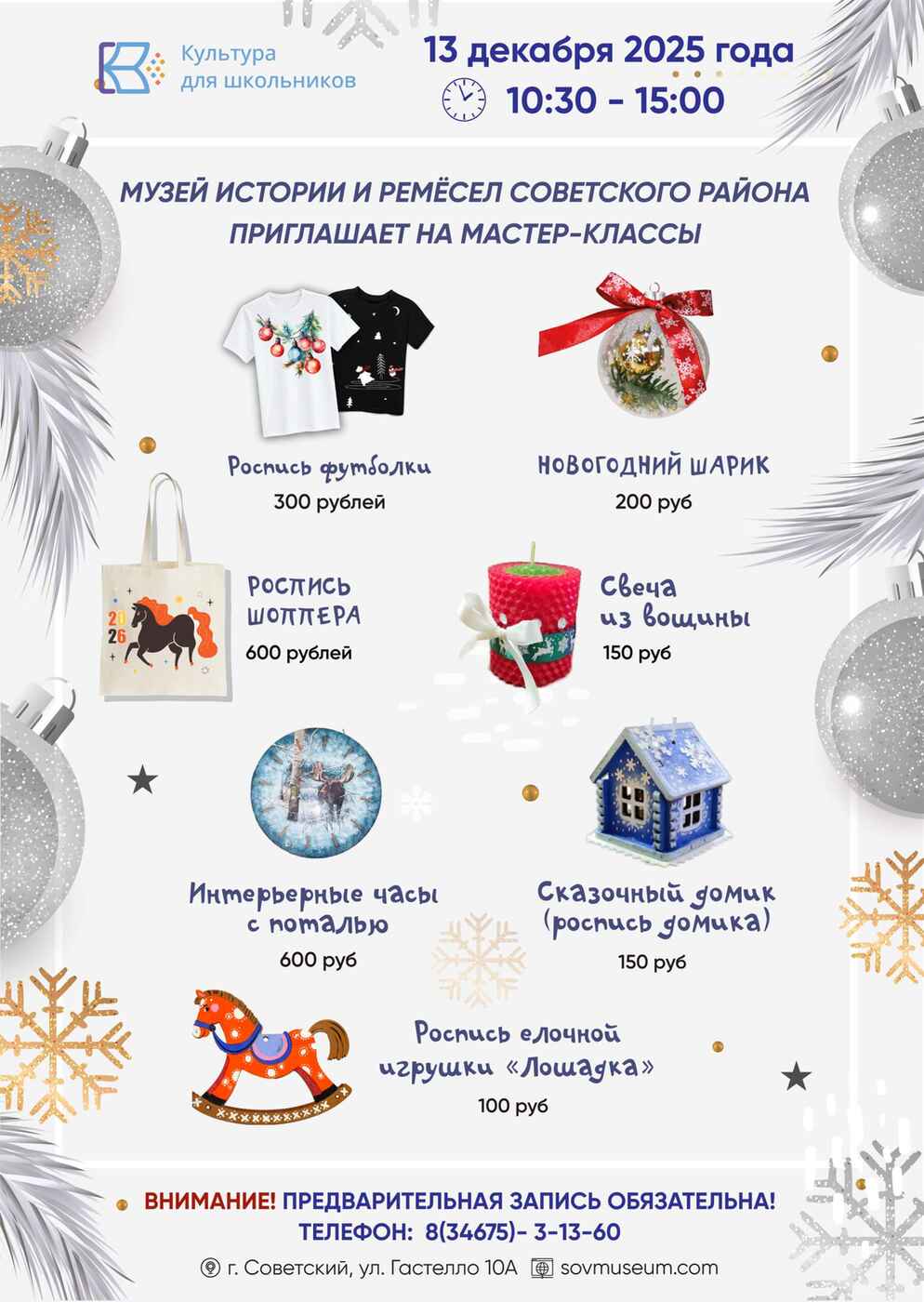 Ждём всех желающих 13 декабря с 10:30 до 15:00 в Музее истории и ремесел Советского района Внимание! Предварительная запись обязательна по телефону: 3-13-60 Наш адрес: г. Советский, ул. Гастелло, 10А