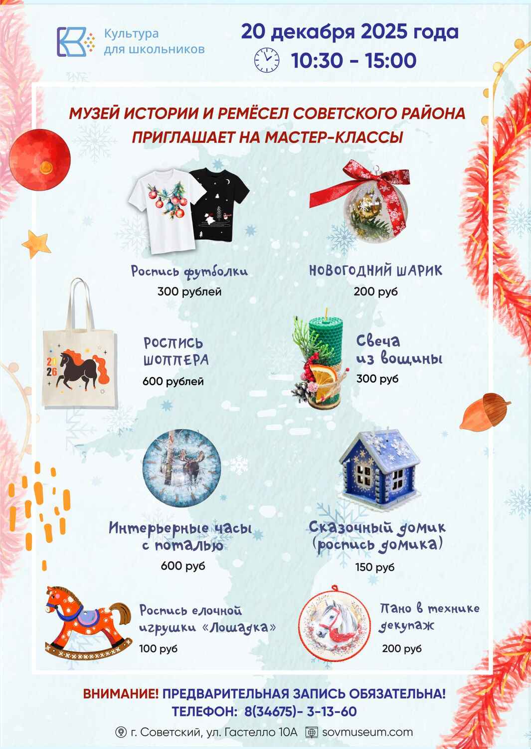 Ждём всех желающих 20 декабря с 10:30 до 15:00 в Музее истории и ремесел Советского района. Внимание! Предварительная запись обязательна по телефону: 3-13-60 Наш адрес: г. Советский, ул. Гастелло, 10А