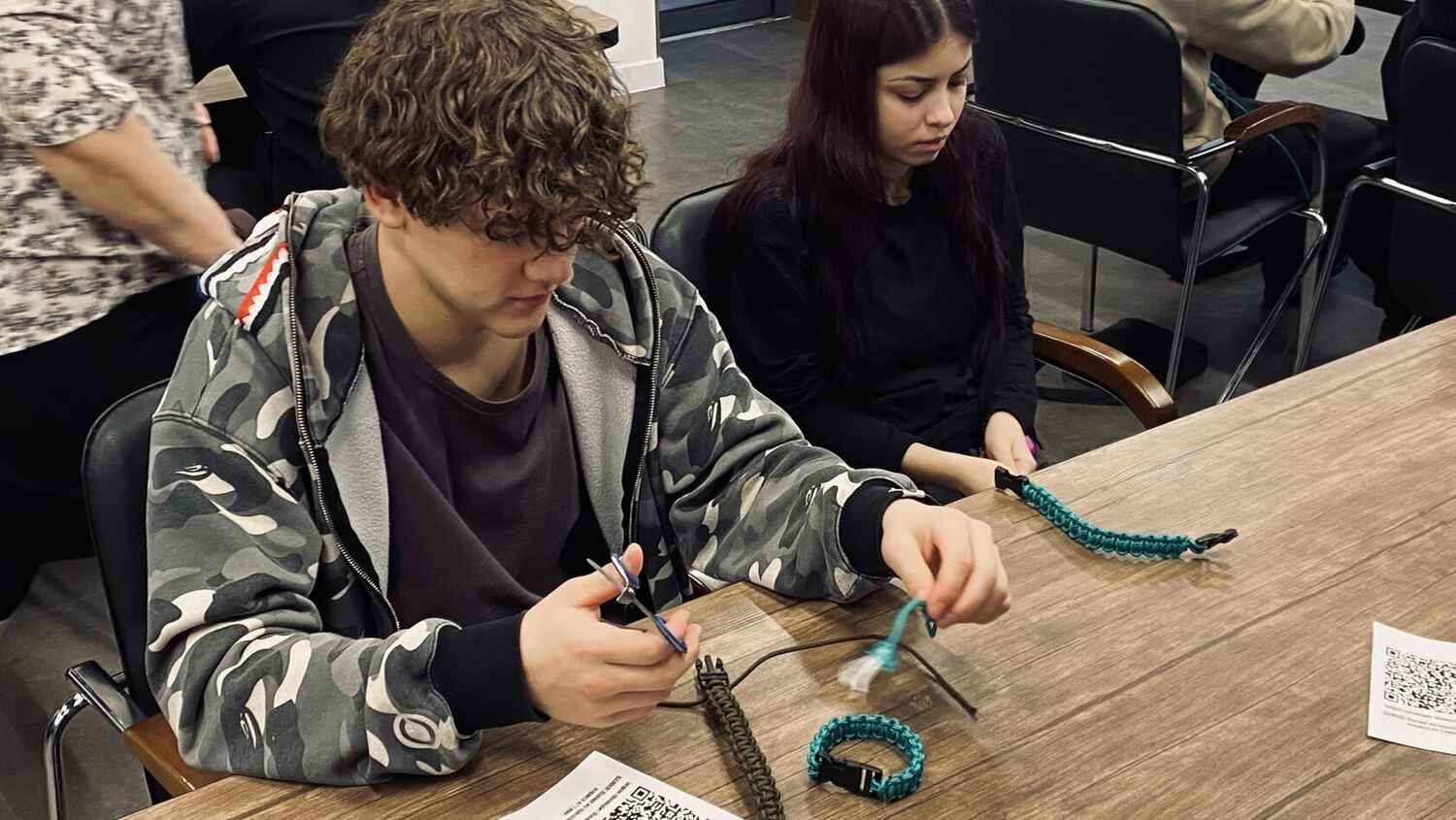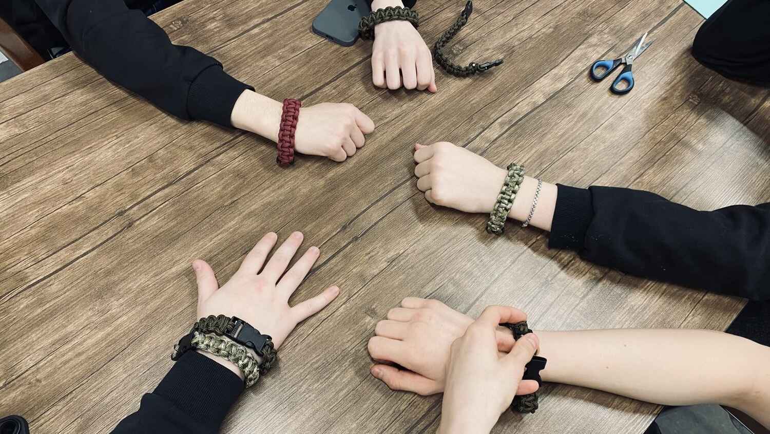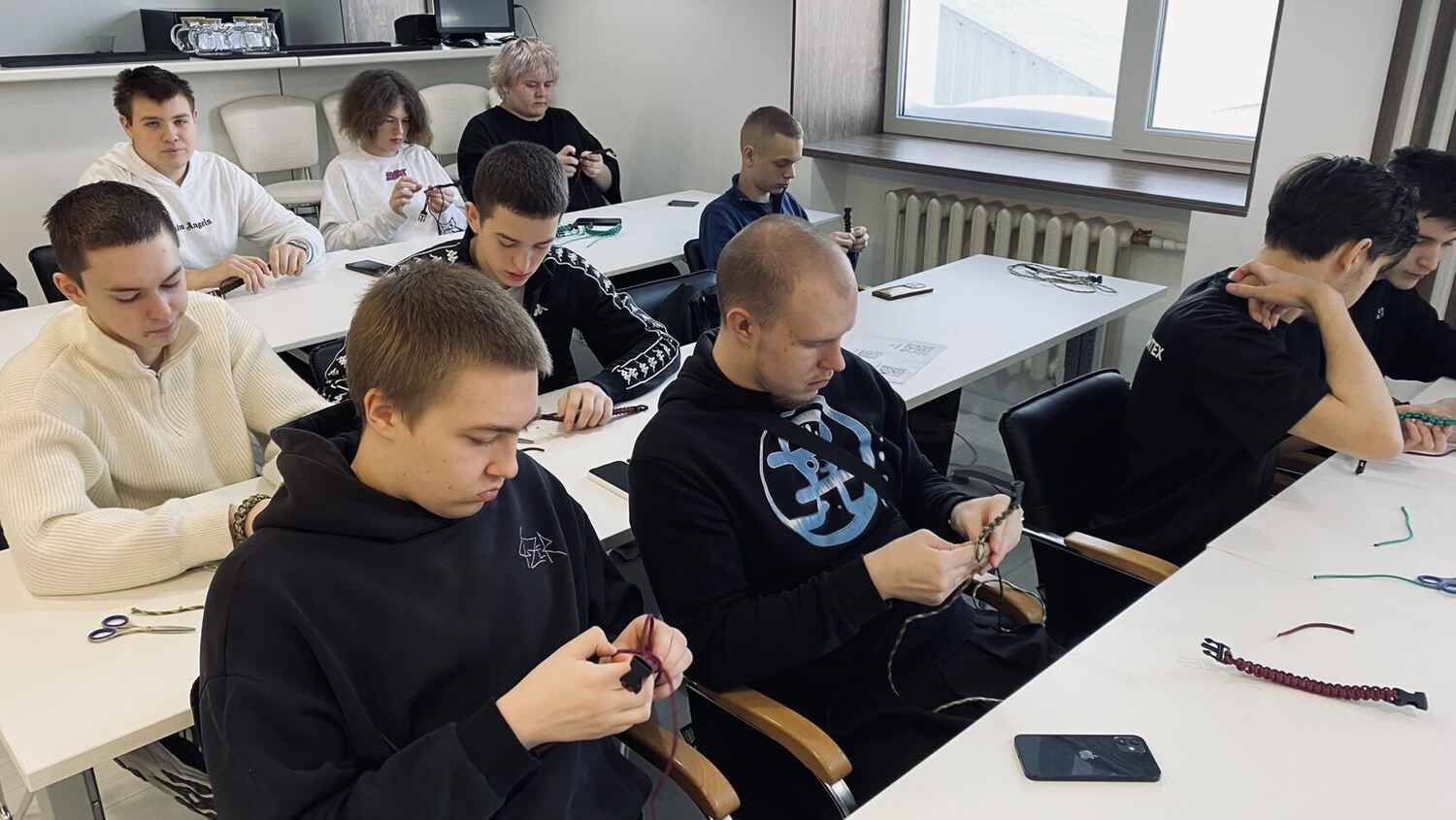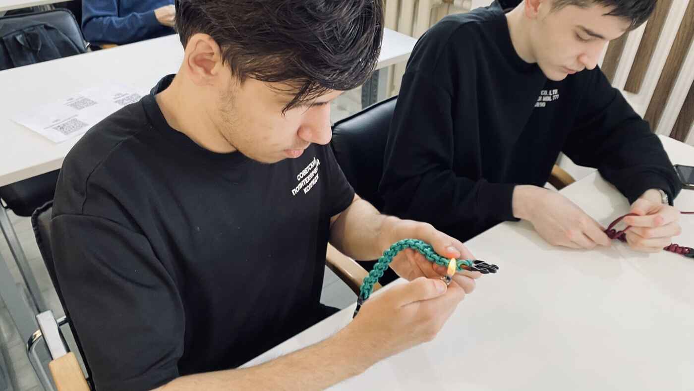 Сегодня сотрудники Музея истории и ремесел Советского района вновь провели для студентов Советского политехнического колледжа практический мастер-класс по плетению браслетов из паракорда. Такие браслеты - многофункциональный тактический аксессуар, прочная нить которого может пригодиться в полевых условиях. Все сплетенные браслеты будут направлены военнослужащим в зону СВО.