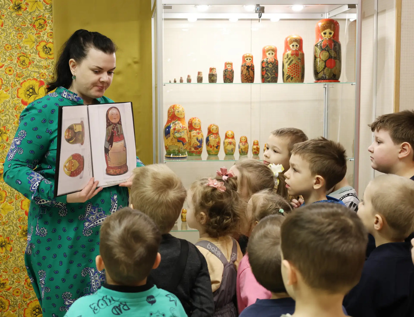Если в начале XX века русская деревянная красавица только завоевывала сердца, то сегодня это полноценный вид искусства. В экспозиции юные участники экскурсии, что рядом с классическими «девушками в платочках» здесь представлены и тематические композиции, посвященные семье, временам года, сказкам и даже историческим событиям.