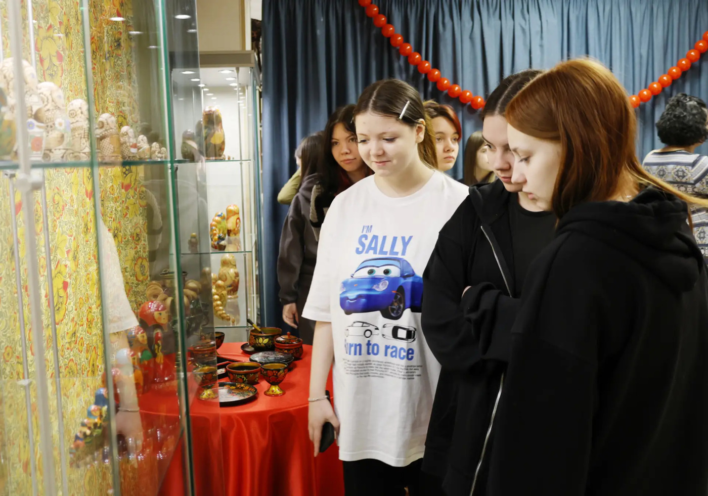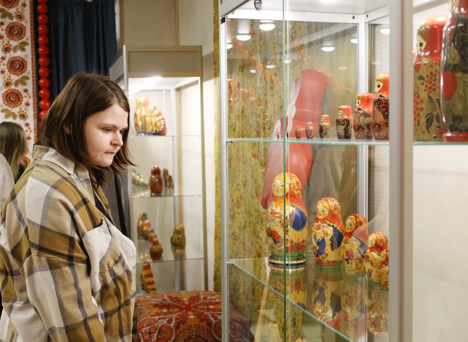 Если в начале XX века русская деревянная красавица только завоевывала сердца, то сегодня это полноценный вид искусства. В экспозиции студенты увидели, что рядом с классическими «девушками в платочках» здесь представлены и тематические композиции, посвященные семье, временам года, сказкам и даже историческим событиям.