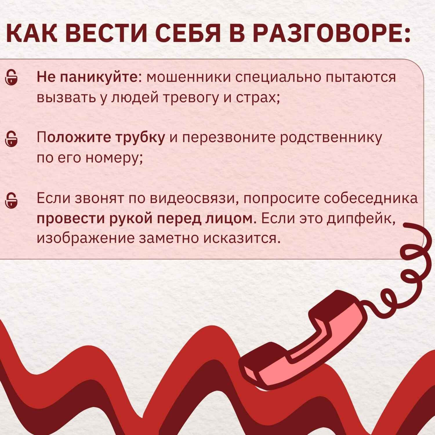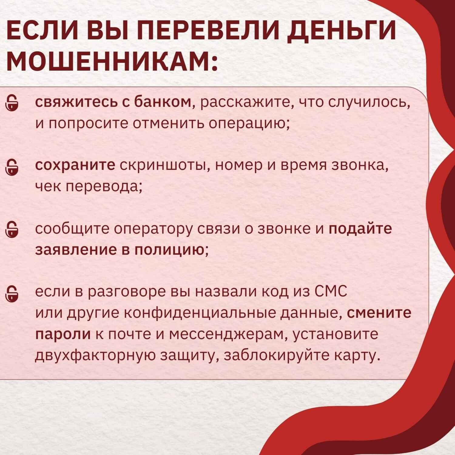• Обучайте близких. Расскажите родным и друзьям о таких мошенничествах, чтобы они тоже были на чеку
