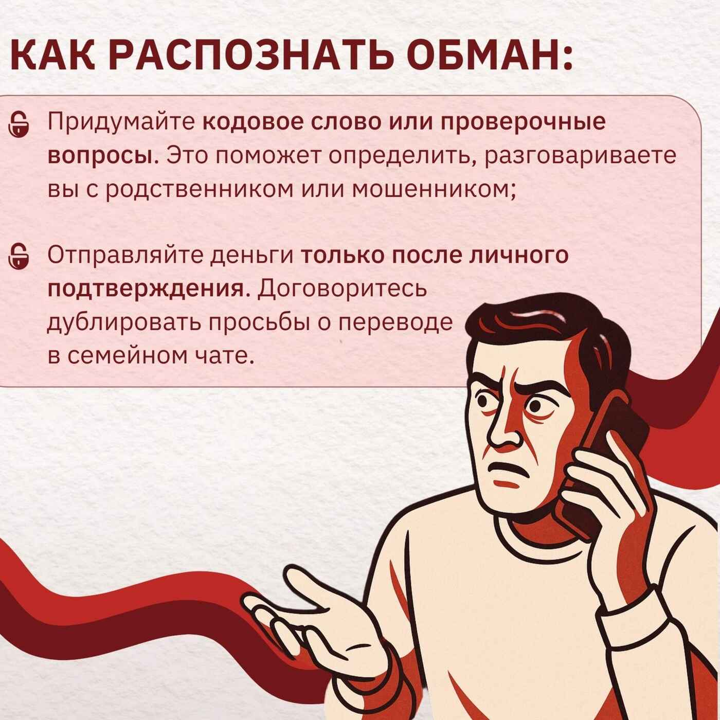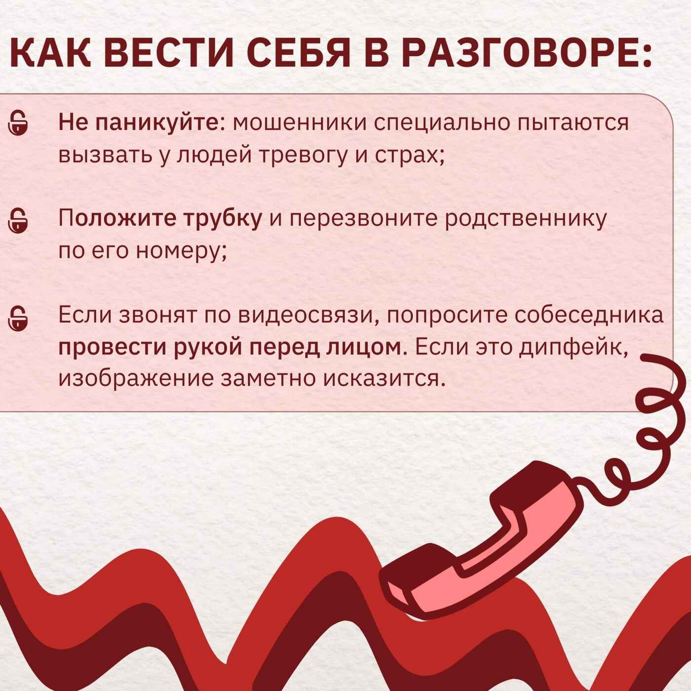• Не спешите переводить деньги. Даже если голос кажется знакомым, остановитесь и подумайте. Позвоните напрямую этому человеку по известному вам номеру, чтобы проверить ситуацию