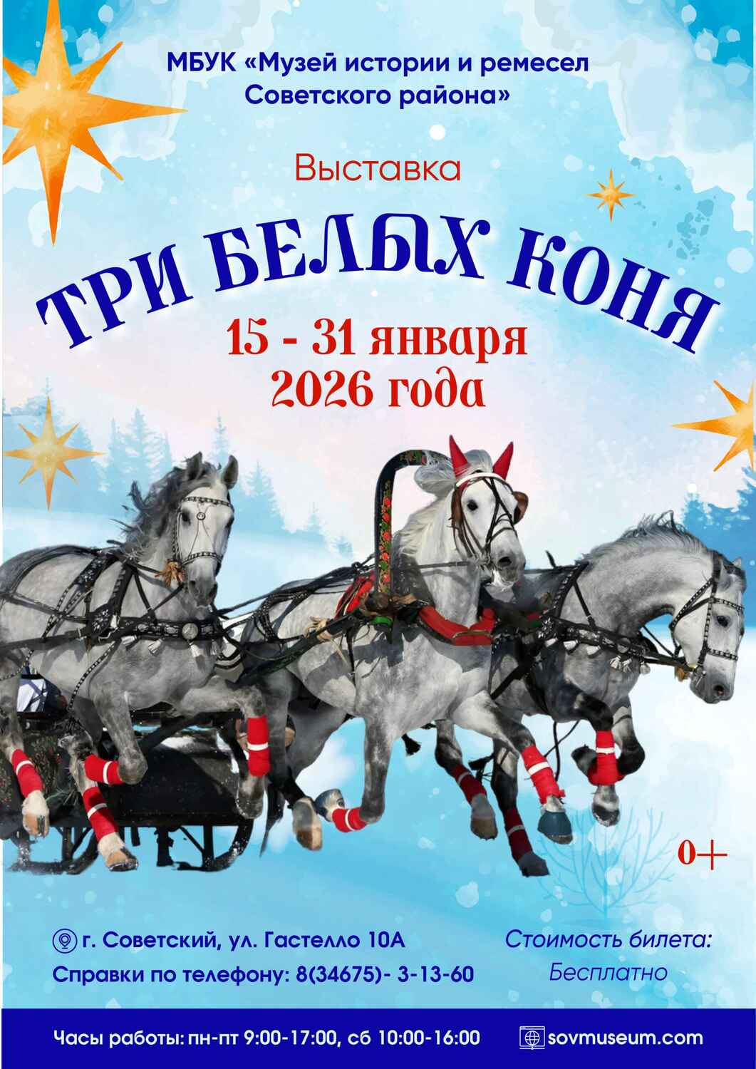 В Музее истории и ремесел Советского района открылась выставка «Три белых коня», посвященная символу наступившего 2026 года - грациозной лошади. Выставка знакомит с удивительным миром этих благородных животных, сыгравших колоссальную роль в истории человечества. Лошади были незаменимыми помощниками человека. Они служили средством передвижения, участвовали в сражениях, помогали в охоте и строительстве, обрабатывали поля и перевозили грузы, трудились в шахтах и рудниках. Образ коня нашёл отражение в народном искусстве, обрядах и крестьянском быту - резными и расписными орнаментами в виде лошади украшали домашнюю утварь. На выставке представлены самые разные воплощения этого благородного животного: от игрушек-качалок, расписных лошадок и шахматных коней - до современных весёлых коняшек. Гости также смогут увидеть элементы конской упряжи - седло, дугу, хомут и подкову, а также статуэтки из стекла, камня, чугуна и фарфора. Особого внимания заслуживают и коллекции марок, открыток и напёрстков, предметы декоративно прикладного искусства с мезенской росписью и настоящие сани волокуши, предоставленные КСС «Олимп». В фойе музея разместились картины с изображением лошадей, выполненных в различных техниках. Здесь можно полюбоваться живописью, фотопечатью, вышивкой крестиком и алмазной мозаикой. Приглашаем вас познакомиться с многогранным образом лошади на выставке «Три белых коня»! Наш адрес: г. Советский, ул. Гастелло, 10А