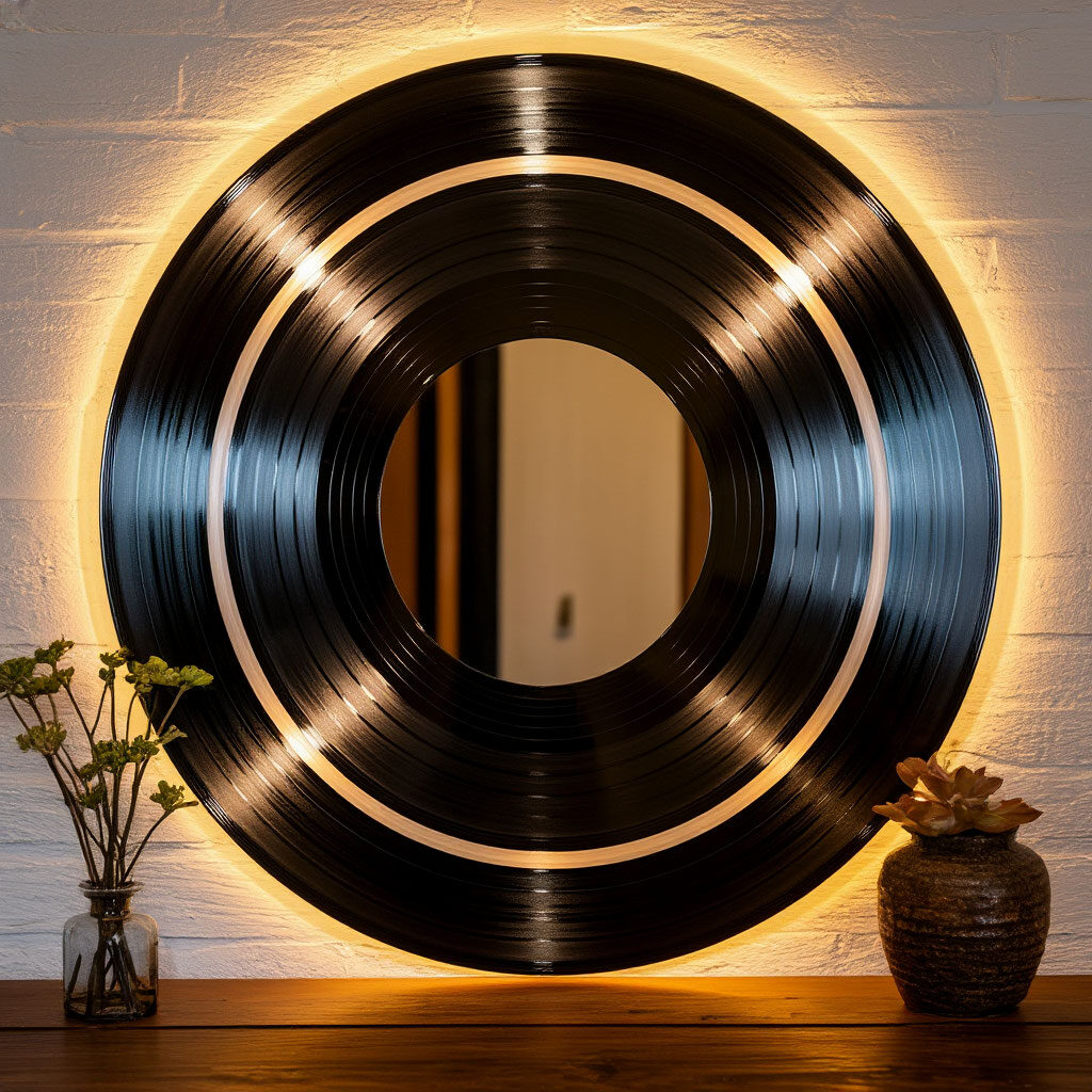 А как может выглядеть эта история сегодня? Нам кажется, винил - это отличный элемент декора! Из пластинки можно создать яркое настенное панно-картину или необычное зеркало.