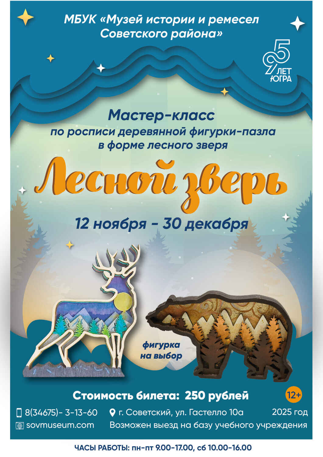 Устали от серых будней? Знаем... Работа, дом, заботы. Но что, если мы скажем, что есть отличный способ всё это ненадолго отложить? В Музее истории и ремесел Советского района вас ждет творческий мастер-класс «Лесной зверь». Представьте, перед вами деревянная фигурка-пазл в виде медведя, волка или оленя... и всё вокруг замирает. Остаётесь только вы, краски и ваш будущий сувенир. Это отличная арт-терапия и самое настоящее удовольствие для души. Наш мастер-класс отлично отвлекает от рутины и подходит даже для тех, кто последний раз рисовал в школе. А еще это классный повод провести время с детьми или друзьями. Стоимость участия: 250 рублей Запись и дополнительная информация по телефону: 3-13-60 Наш адрес: г. Советский, ул. Гастелло, 10А | |