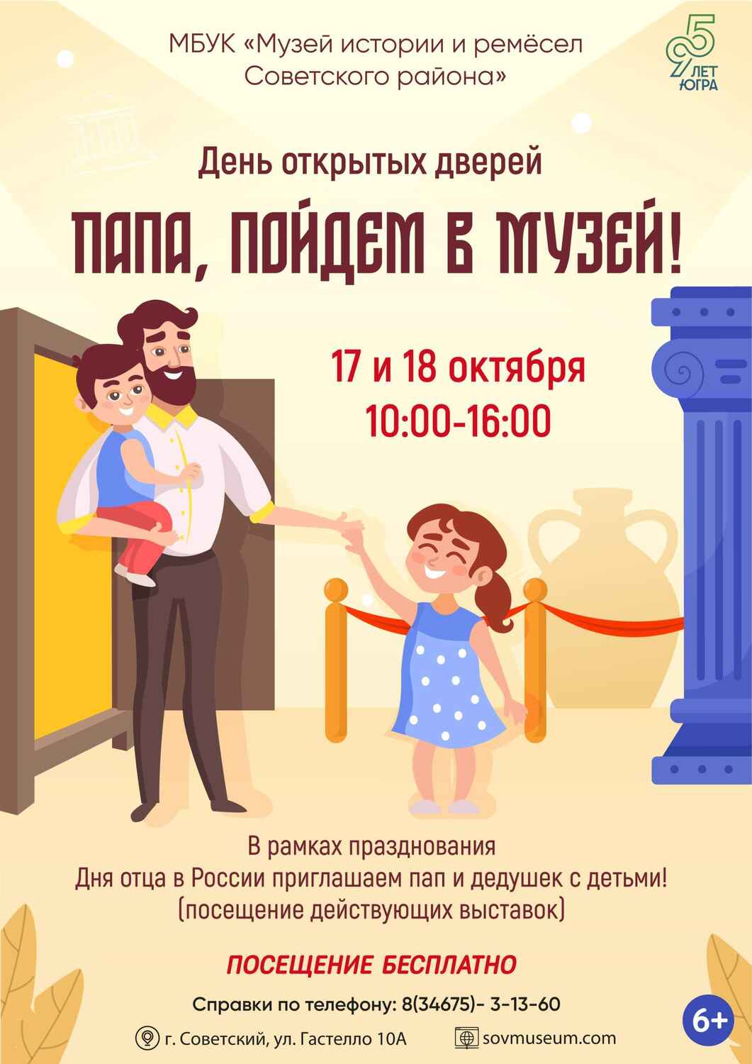 Дорогие папы и дедушки! В честь Дня отца в России Музей истории и ремесел Советского района проводит День открытых дверей «Папа, пойдем в музей!». 17 и 18 октября мы ждем вас с детьми на бесплатные экскурсии по действующим выставкам и интересные мастер-классы. Приходите в любой из этих дней с 10:00 до 16:00, чтобы провести время вместе с пользой и получить море ярких впечатлений!