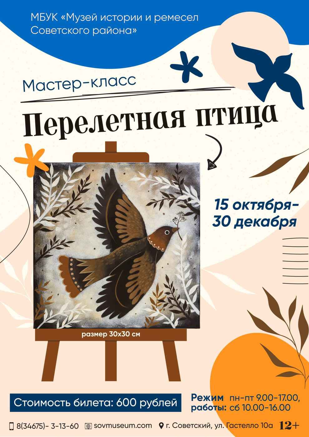С 15 октября Музей истории и ремесел Советского района приглашает на новый мастер-класс по живописи «Перелетная птица». Опытный мастер поможет создать картину с изображением птицы всего за несколько часов! Размер холста: 30x30 см. Стоимость участия: 600 рублей. Все необходимые материалы уже включены в стоимость, а помощь и поддержка обеспечены на каждом этапе работы. Просто приносите с собой хорошее настроение и готовность творить!