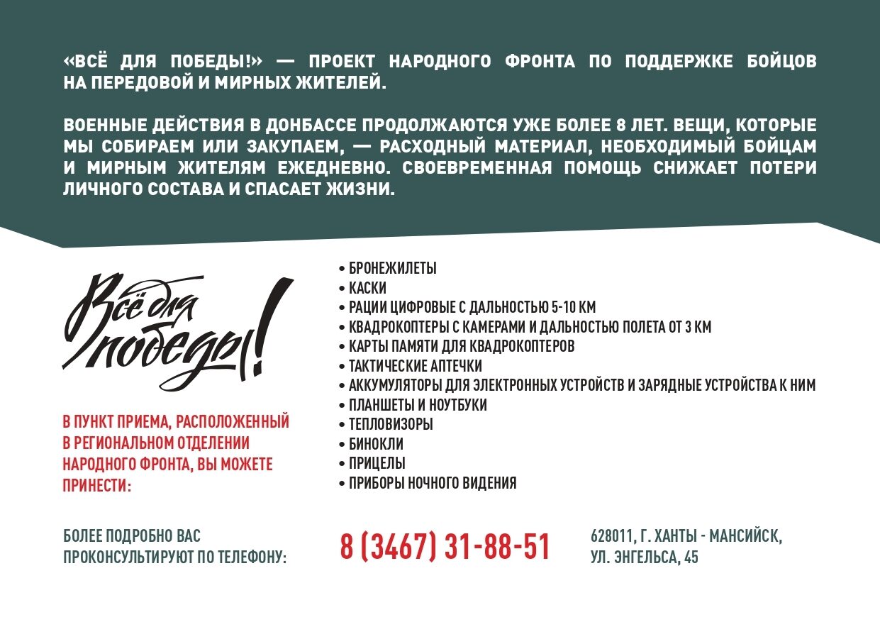 Принять участие в проекте «Все для Победы» и оказать целевую благотворительную помощь солдатам может любой желающий. Также оказать поддержку можно с помощью перевода денежных средств через QR код в информационной карточке. Благодаря сборам Региональный исполкомом ОНФ в автономном округе приобретает необходимую технику и различное оборудование, которое помогает снижать потери личного состава.