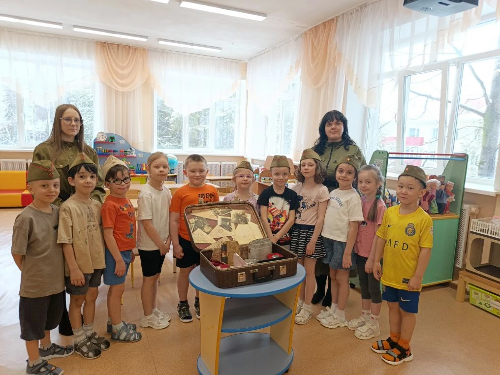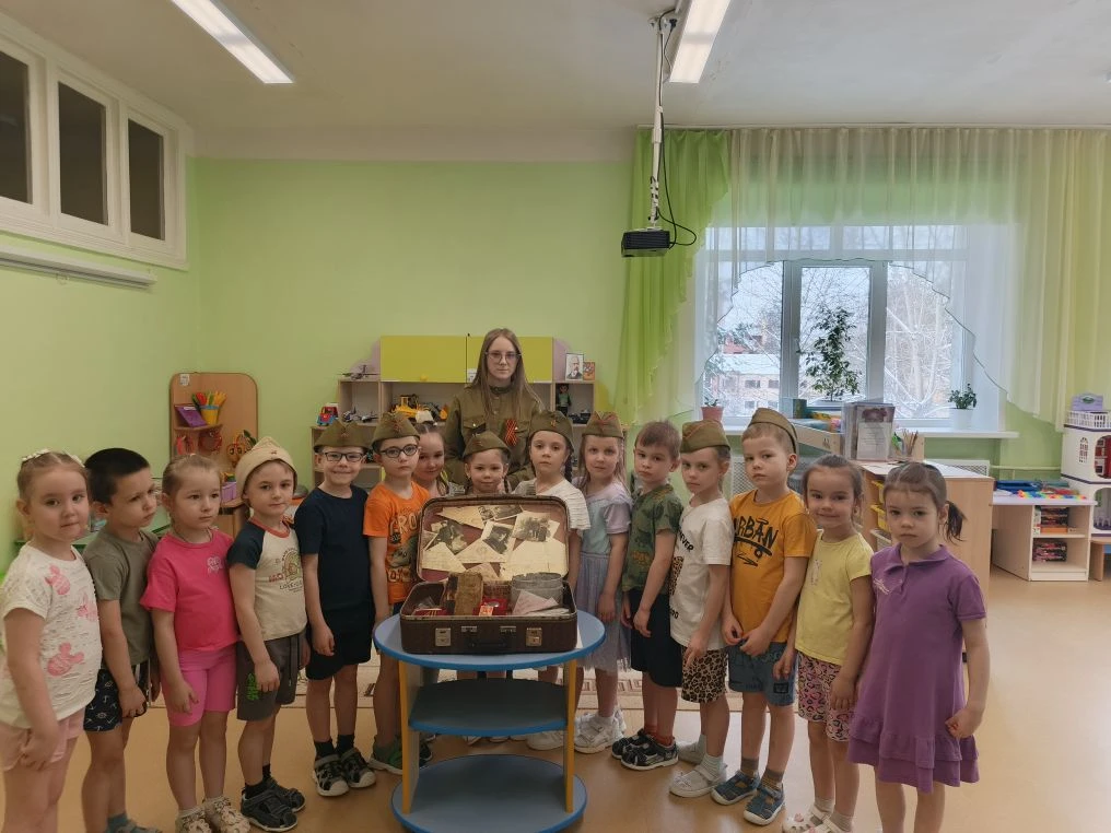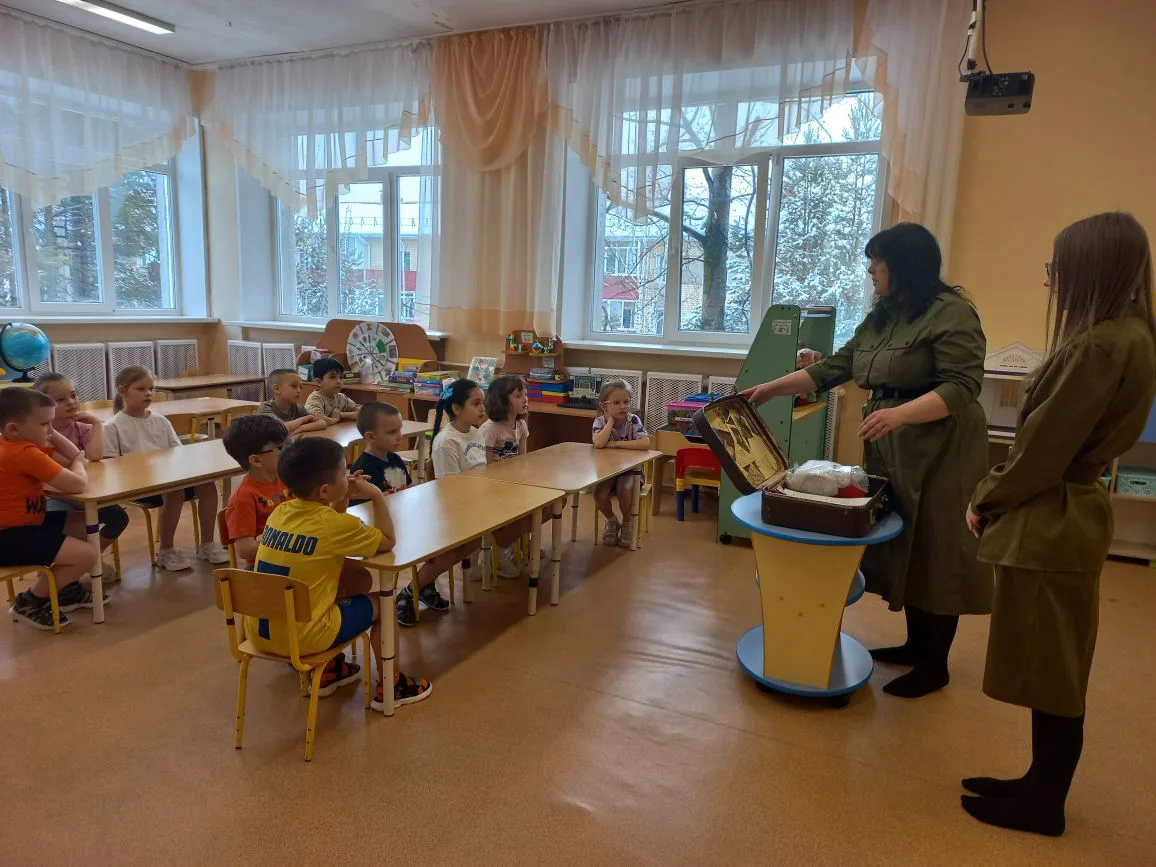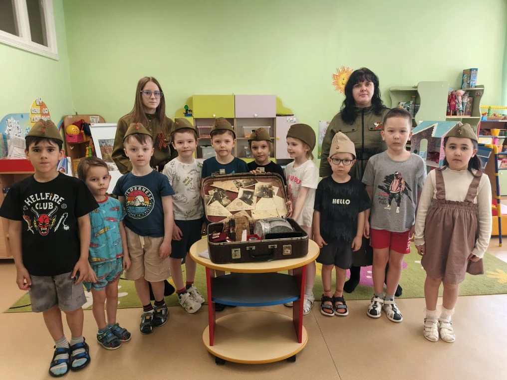 Выездное мероприятие под названием «Что принес солдат с войны» состоялось сегодня в городе Югорске. Его участниками стали воспитанники детского сада «Снегурочка» из групп «Звездочки», «Почемучки», «Светофорики» и «Знайки», которые также входят в отряд «Юнармия» Движения Первых. С помощью экспонатов, собранных в музейном чемодане, дети познакомились с историей рядового Александра и узнали, каким неимоверным трудом досталась нашему народу победа в Великой Отечественной войне. Каждый ребенок смог внимательно рассмотреть солдатские награды и личные вещи: армейский котелок, ложку и губную гармошку. Особый интерес вызвала военная пилотка, которую ребята смогли примерить. Кроме того, маленькие югорчане услышали отрывки из фронтовых писем-треугольников. В годы войны они были единственной ниточкой, связывавшей бойцов с родными. В завершение встречи дети изготовили брошь «Победа» из георгиевской ленты.