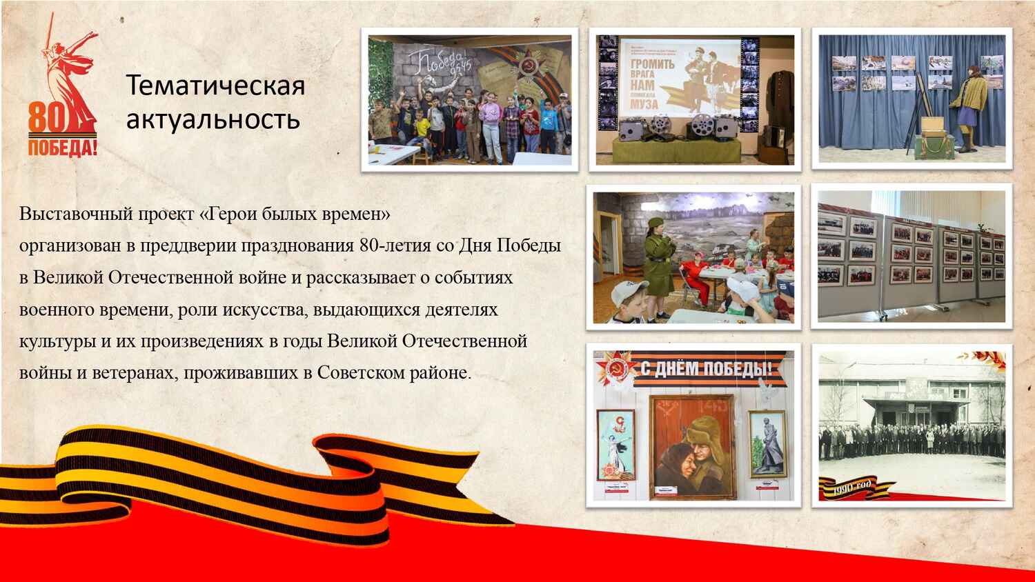 Выставочный проект «Герои былых времен» организован в преддверии празднования 80-летия со Дня Победы в Великой Отечественной войне и рассказывает о событиях военного времени, роли искусства, выдающихся деятелях культуры и их произведениях в годы Великой Отечественной войны и ветеранах, проживавших в Советском районе. | |